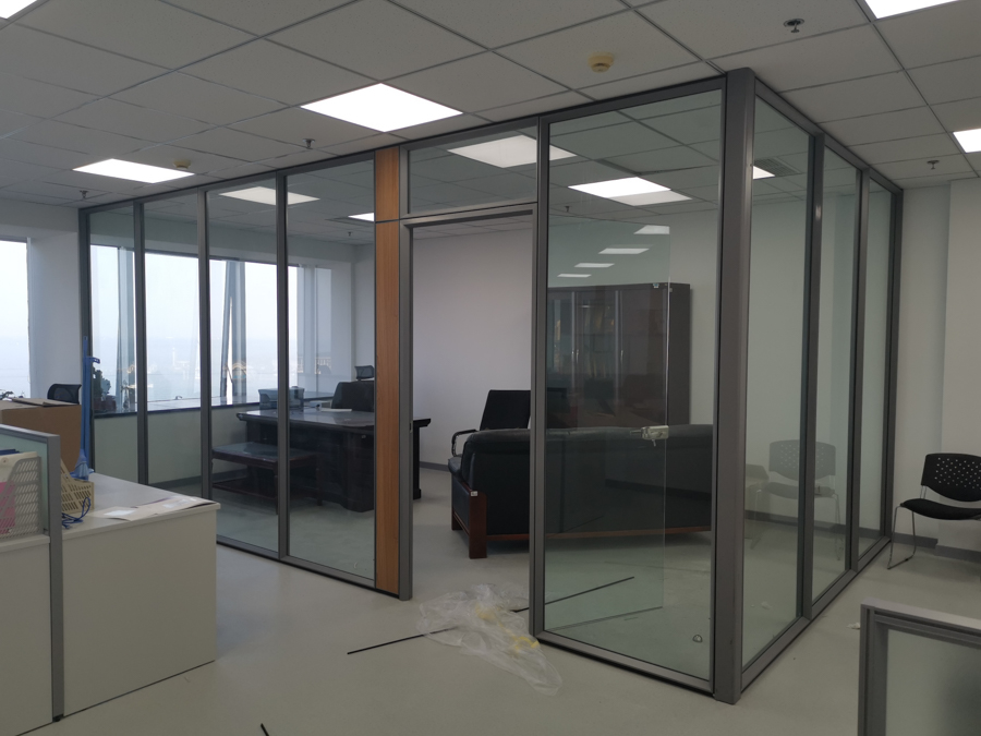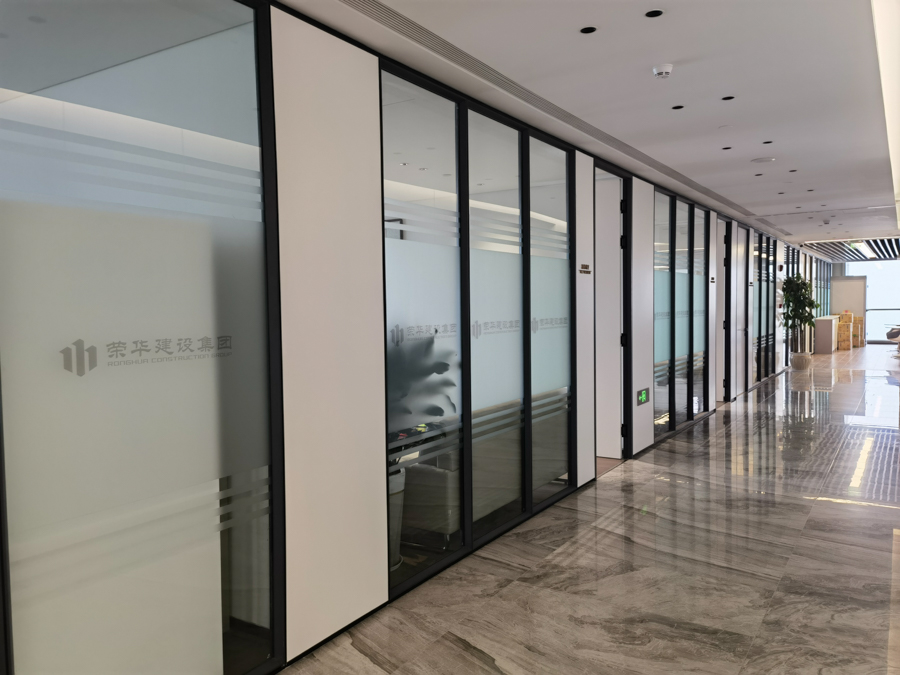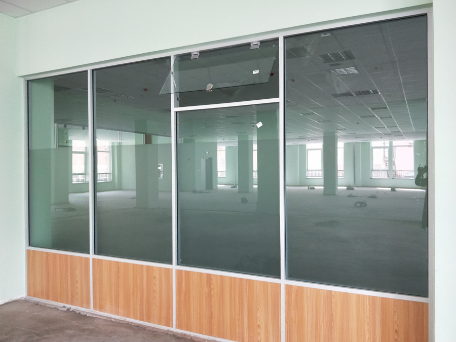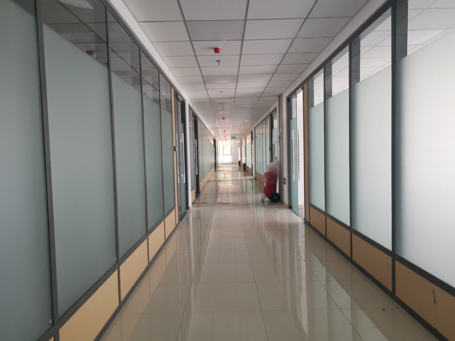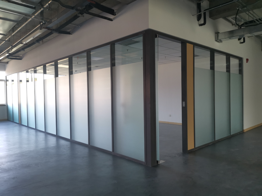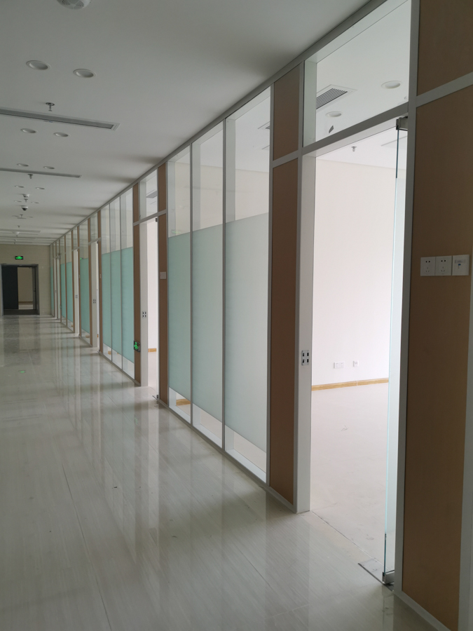 海信學(xué)校項(xiàng)目:HX-85款氧化銀色單層10mm鋼化玻璃及裝飾板復(fù)合隔斷,隔斷配套12mm鋼化玻璃門及門禁系統(tǒng)。