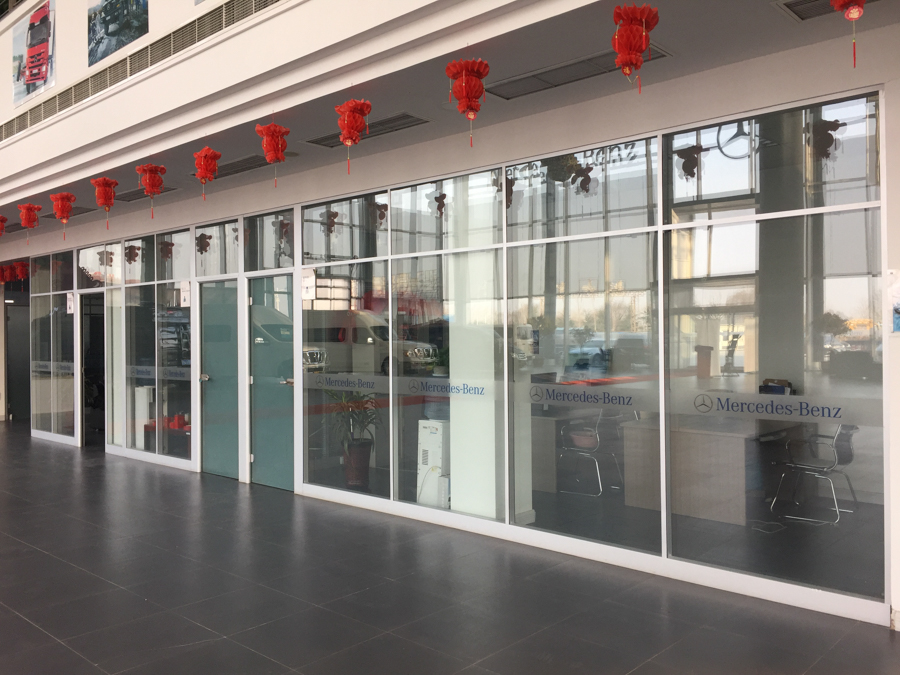 梅賽德斯-奔馳4S展廳項(xiàng)目:HX-85款氧化銀色及氟碳噴涂9006色,雙層6mm鋼化玻璃內(nèi)置百葉隔斷,隔斷配套單玻有框門扇。展廳自動(dòng)門系統(tǒng)采用松下自動(dòng)門及扶桑重疊門機(jī)。